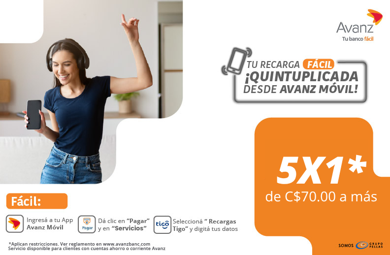 Quintuplicá tus recargas Tigo de C$70.00 a más desde Avanz Móvil.