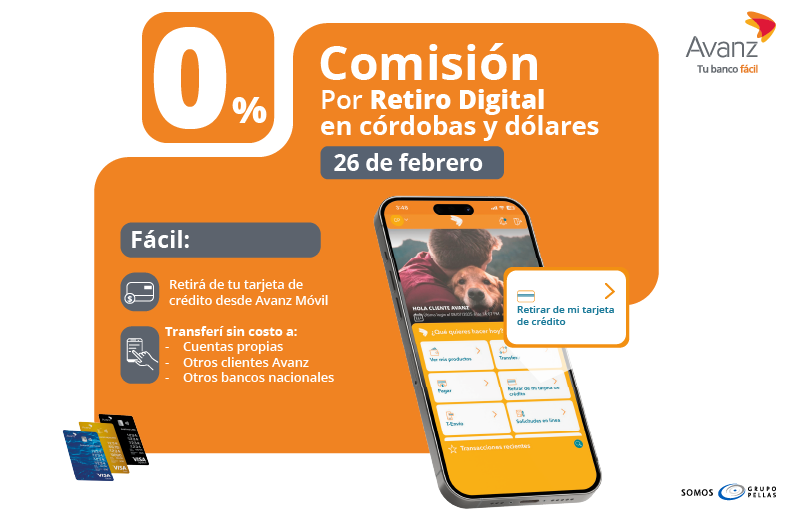 0% comisión por retiro digital en córdobas y dólares desde Avanz Móvil. Válido el 26 de febrero de 2026.